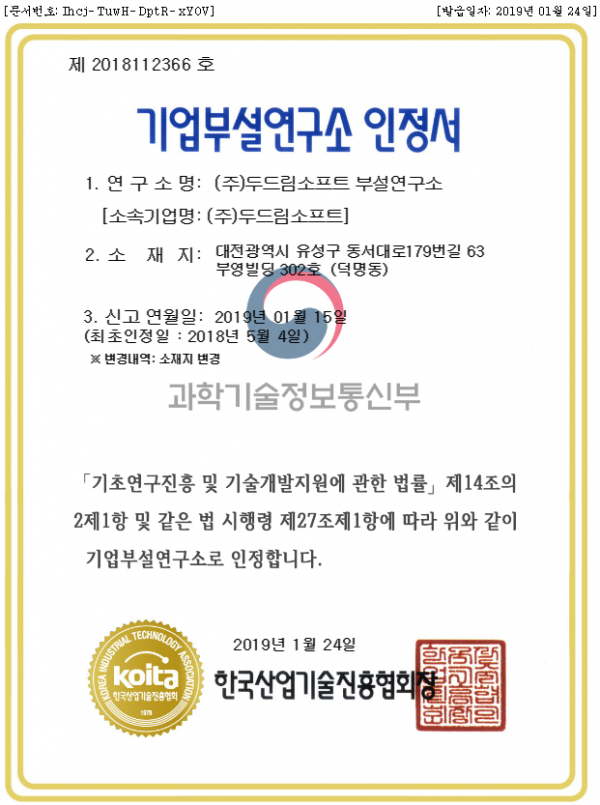 주식회사 두드림소프트는 2018년 5월 기업부설연구소를 설립